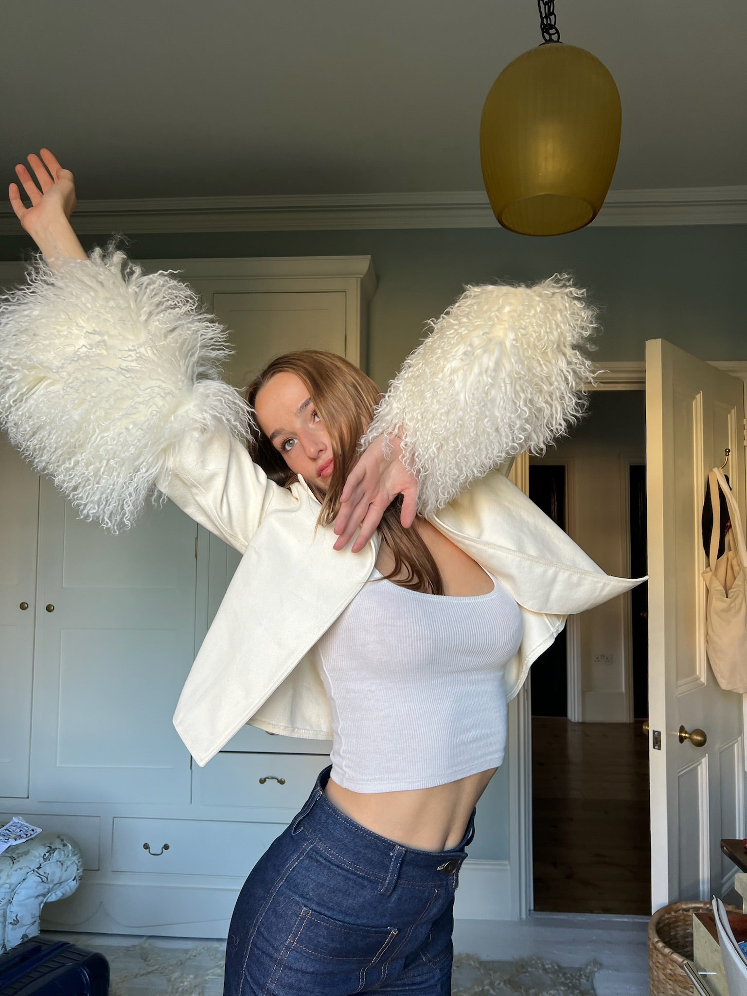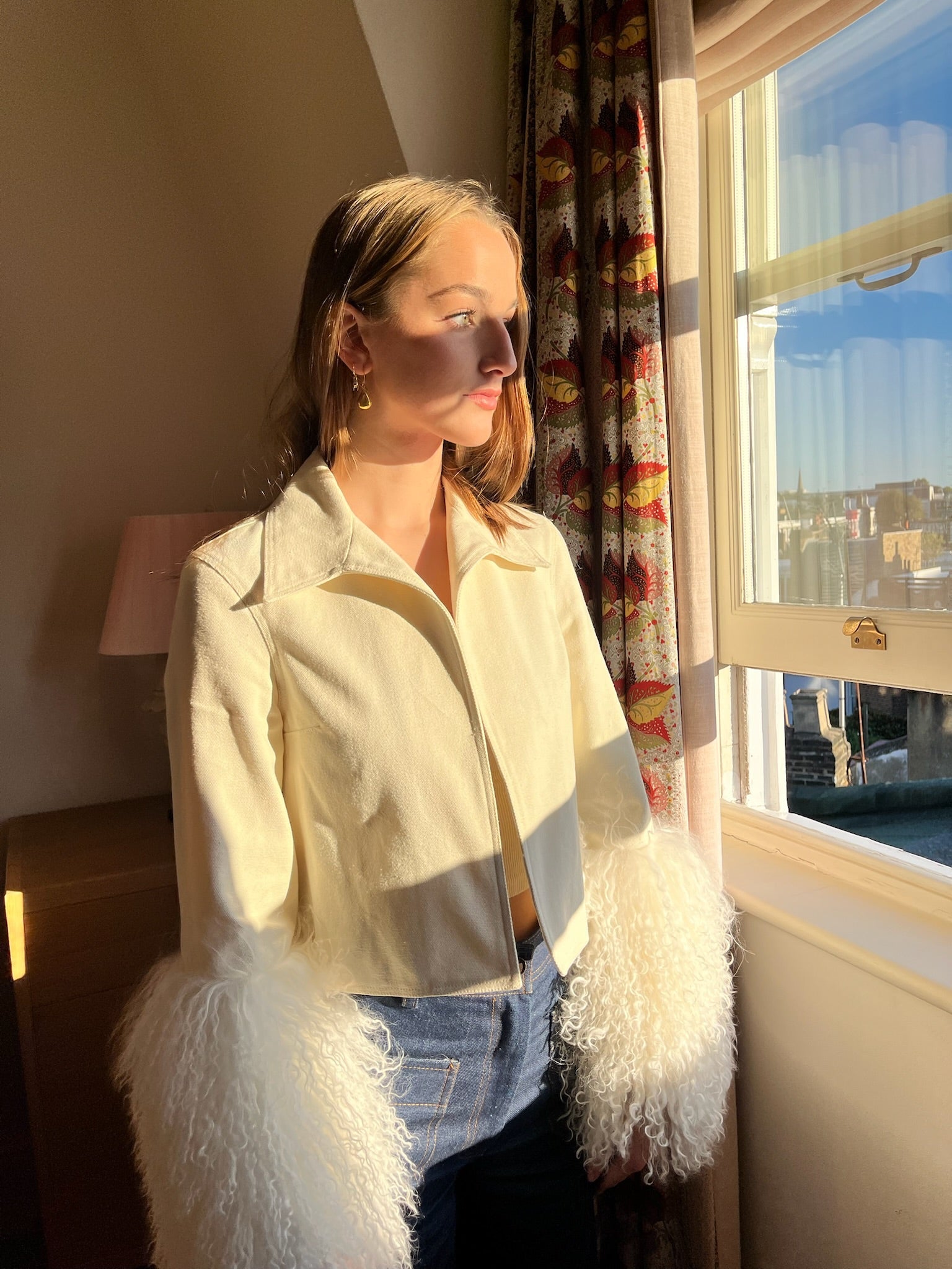 100% Cotton Cream Canvas Cropped Jacket With Fur Cuffs